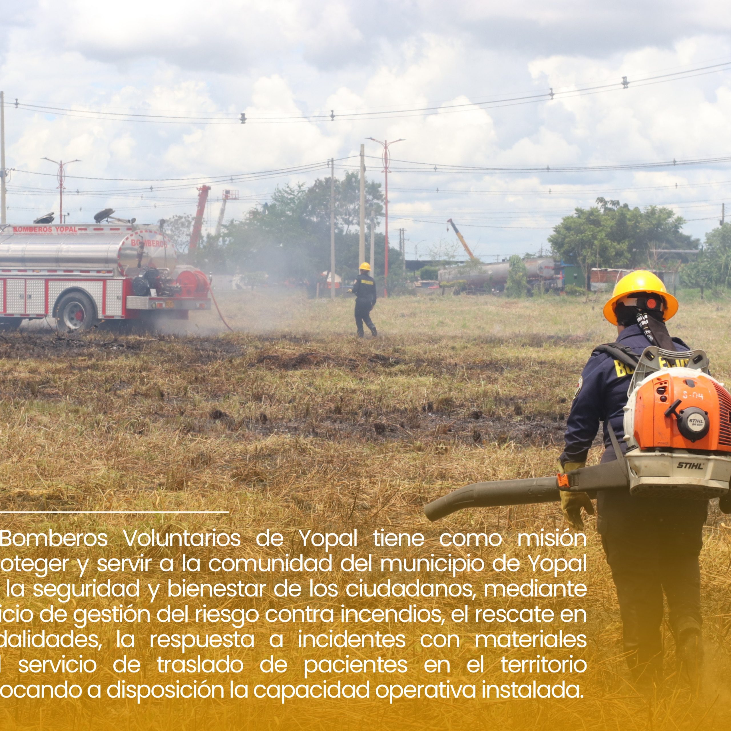 El Cuerpo de Bomberos Voluntarios de Yopal tiene como misión fundamental proteger y servir a la comunidad del municipio de Yopal para garantizar la seguridad y bienestar de los ciudadanos, mediante un efectivo servicio de gestión del riesgo contra incendios, el rescate en todas sus modalidades, la respuesta a incidentes con materiales peligrosos y el servicio de traslado de pacientes en el territorio colombiano, colocando a disposición la capacidad operativa instalada.